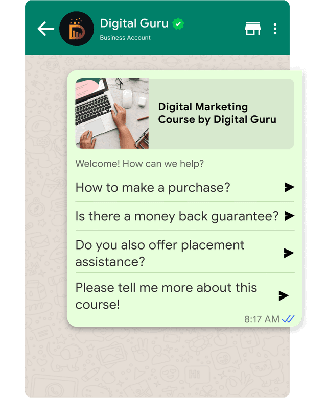 Amplify your marketing ROI by generating qualified leads, answering prospects instantly, and increasing trust with the help of interactive Facebook and Instagram ads that take your prospects to WhatsApp.