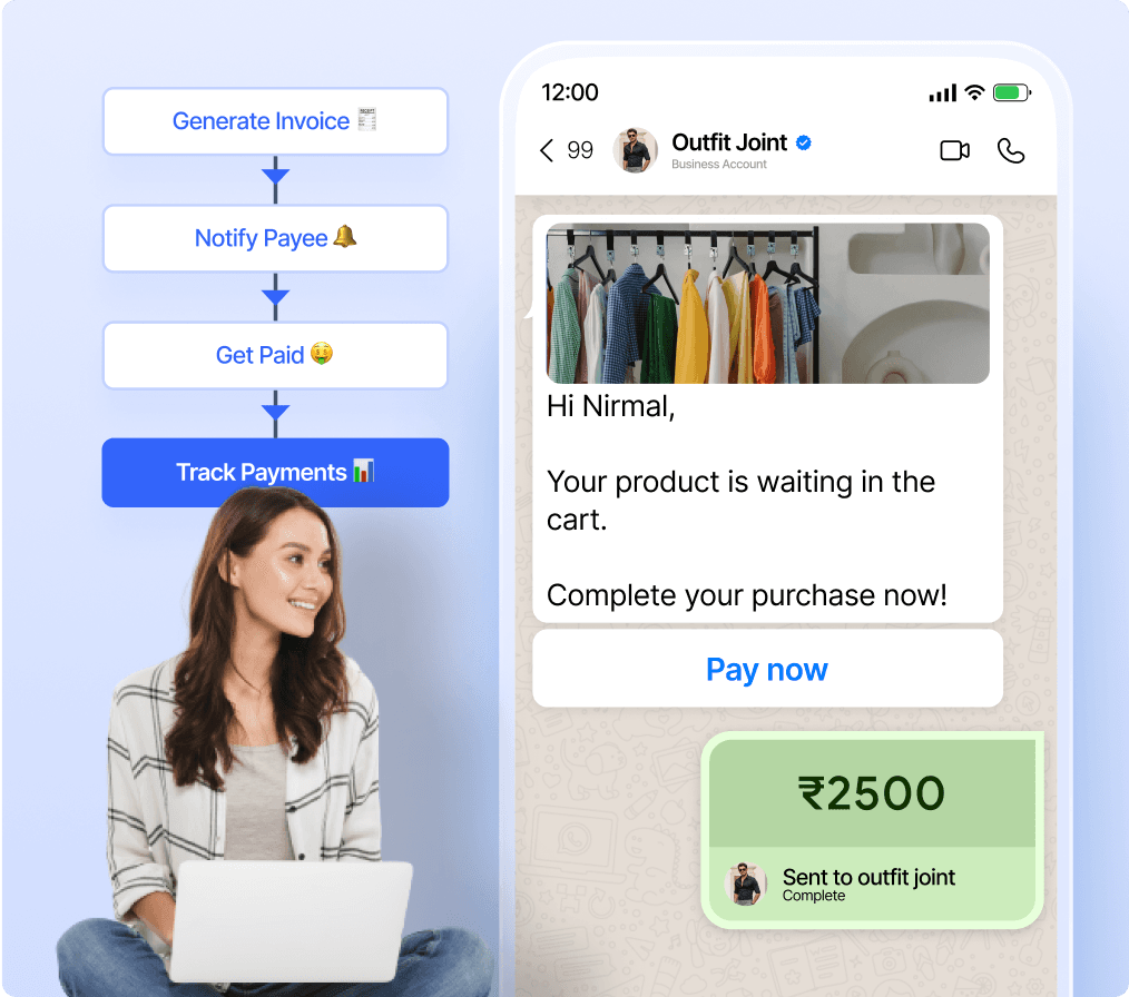 Automate payment reminders, generate one-click payment links, and send instant invoices — all within WhatsApp.