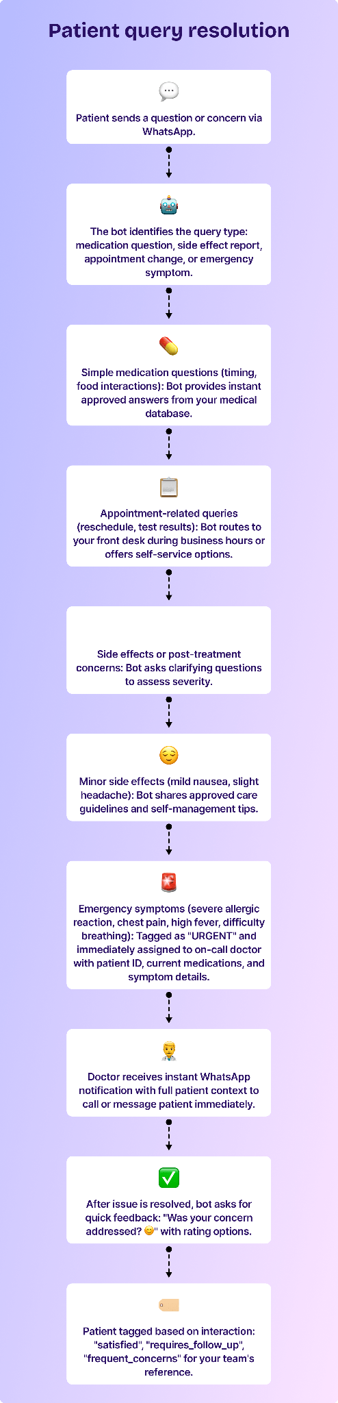 This module lets your patients ask questions or report concerns via WhatsApp anytime, instead of panicking and rushing to the ER or calling your clinic repeatedly. The bot answers common questions instantly (like "Can I take this medicine with food?") and immediately escalates serious symptoms to your on-call doctor. This gives patients peace of mind while ensuring your medical team only handles cases that truly need their attention.