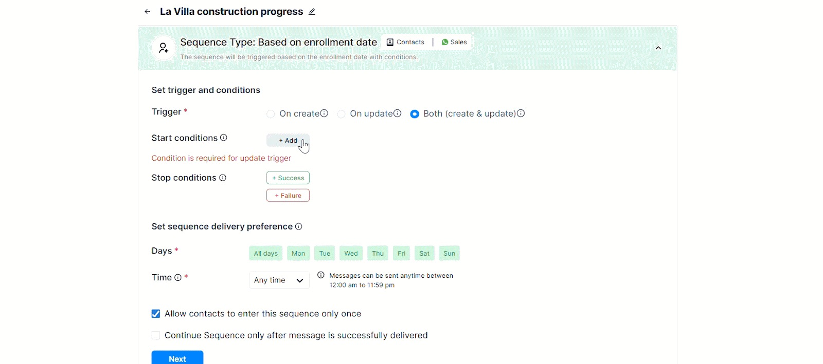 4. Select the start and stop conditions and when you want the sequence to be triggered.