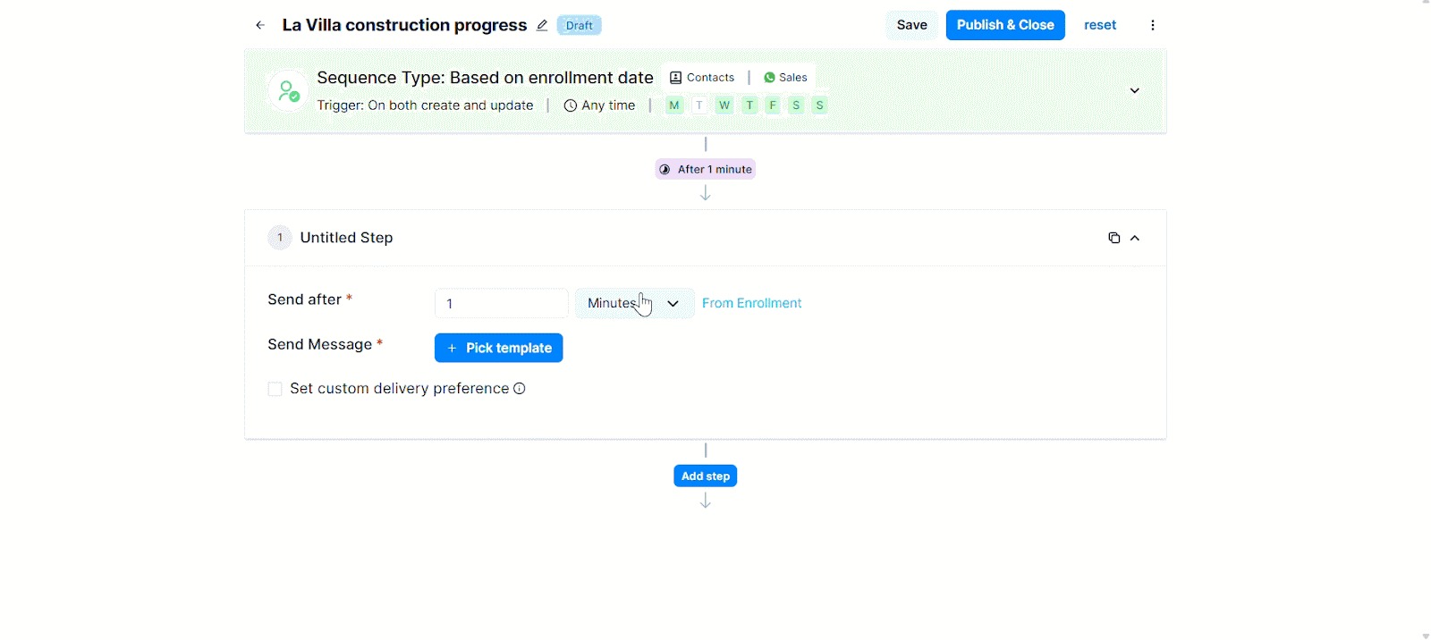 5. Select the messages you want to send. Ensure that you submit your message for approval beforehand. Similarly, you can set the next steps of the sequence and set when each step must be triggered.